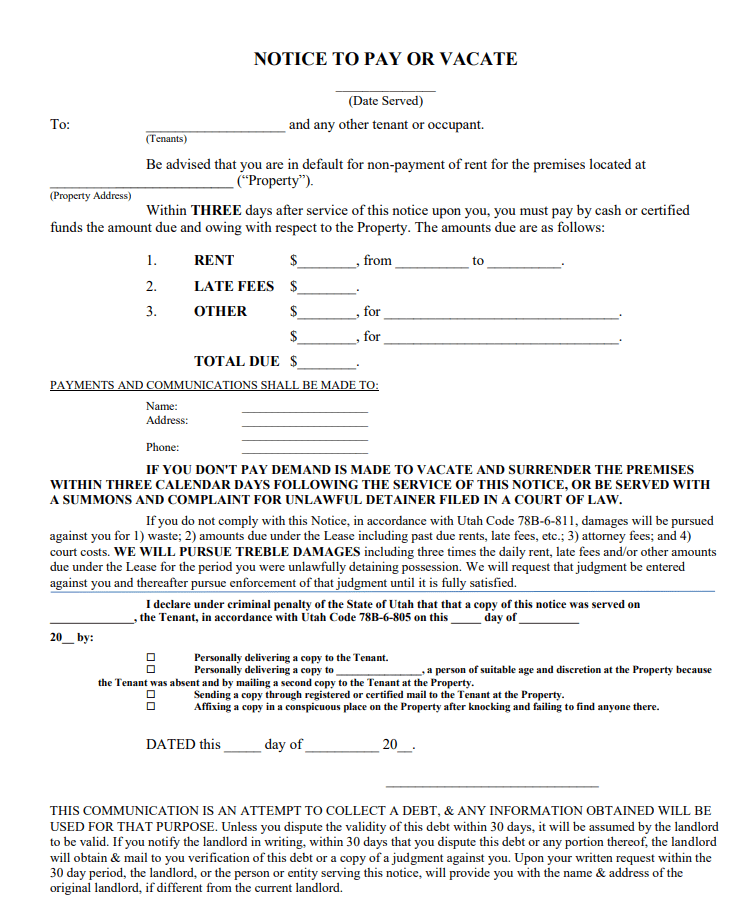 This is a Notice to Pay or vacate. Use this notice when the tenant has not paid rent.