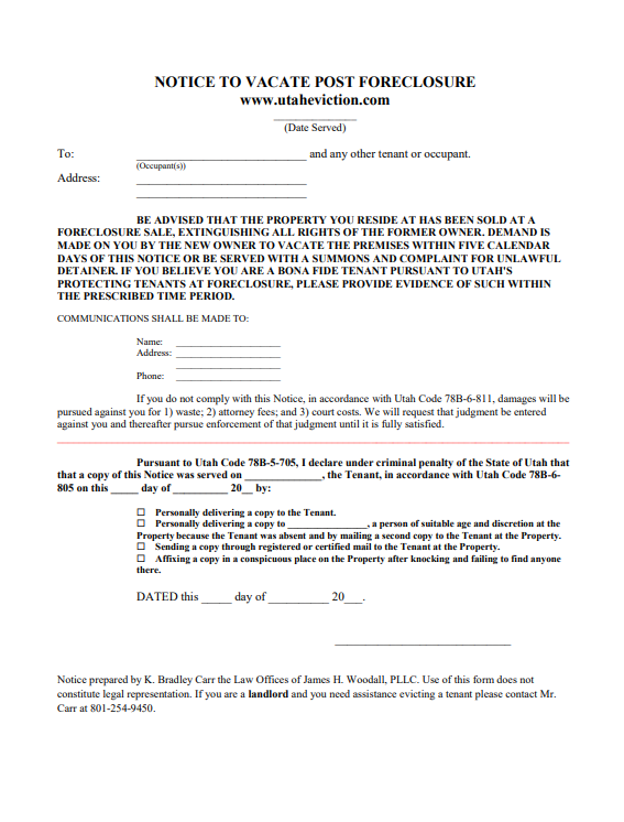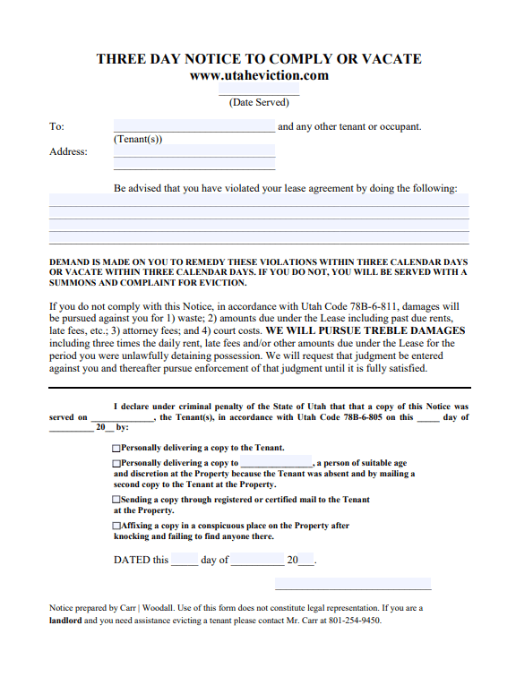 Make use of our free Utah eviction forms. If you have a question on any of them, please do not hesitate to call our office and speak with one of our staff regarding the use of these forms and any other questions you have. If the tenant fails to vacate within the time period, we can have an eviction attorney assist you in moving the eviction forward as quickly as possible. Most of our evictions take 2-4 weeks from the expiration of the notice until completion. Simply pick the correct notice and click download. If you would like us to prepare and serve the notice, we offer that service for $100.00.