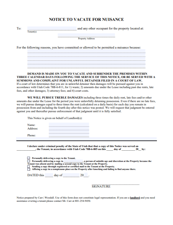 This is a Notice to Vacate for Nuisance. Use this notice when the tenant has interfered with the quiet use and enjoyment of other tenants or residents in the neighborhood or complex (like smoking).